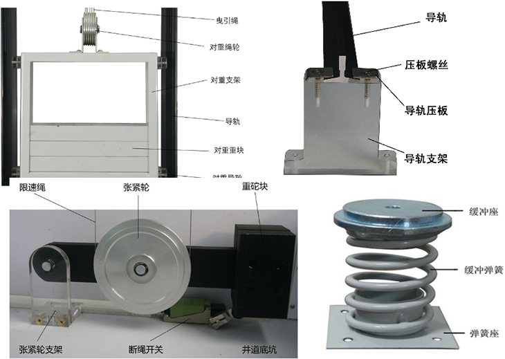 電梯井道部分:導軌、對重機構、轎廂(門(mén)機機構、安全鉗、導靴、照明燈、風(fēng)扇)、層門(mén)、樓層召喚指示控制器、曳引繩、導向輪、一層平層感應器(計數復位)、上(下)限位開(kāi)關(guān)、上(下)極限開(kāi)關(guān)、隨行電纜、轎廂控制器、緩沖器。