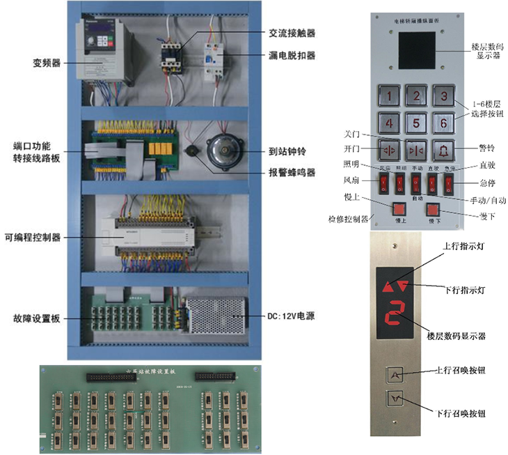 電梯電氣控制部分:電源空氣開(kāi)關(guān)(漏電脫扣器)、DC12V驅動(dòng)電源、PLC可編程控制器、接線(xiàn)端口電路板、到站鐘、變頻器、報警蜂鳴器。