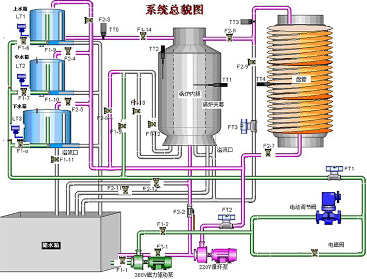 實(shí)驗對象系統包含有:不銹鋼儲水箱;上、中、下三個(gè)串接有機玻璃圓筒型水箱;三相4.5kW電加熱鍋爐(由不銹鋼鍋爐內膽加溫筒和封閉式外循環(huán)不銹鋼冷卻鍋爐夾套構成)和鋁塑盤(pán)管組成。