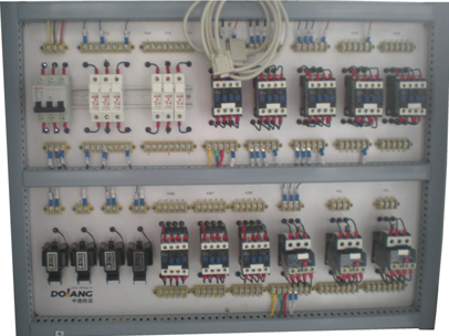 裝置實(shí)驗柜正面為車(chē)床和銑床的機床電氣線(xiàn)路元器件布線(xiàn)區面板。背面是鉆床和磨床的機床電氣線(xiàn)路元器件布線(xiàn)區面板。面板上裝有低壓斷路器、直插式保險絲、交流接觸器、熱繼電器、控制變壓器等元器件,這些元器件直接安裝在面板表面,可以很直觀(guān)的看它們的動(dòng)作情況,且都有相應的測試點(diǎn),方便接線(xiàn)及故障考核檢測線(xiàn)路操作。