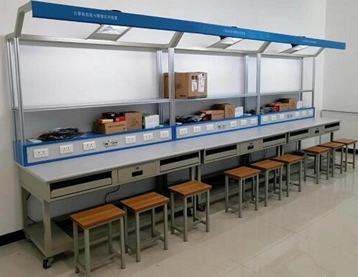 1、實(shí)訓臺:采用工業(yè)鋁合金型材框架,共兩層,其中第一層可放置維修工具、套件、儀器儀表;第二層可放顯示器,頂部設有30W日光燈一盞和風(fēng)扇一臺。實(shí)訓臺設有一個(gè)抽屜、兩個(gè)鍵盤(pán)托架、兩個(gè)主機柜,下方有四個(gè)剎車(chē)的萬(wàn)向輪。