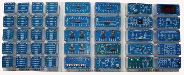 提供一套實(shí)訓模塊,可以完成直流電路、模擬電子技術(shù)、數字電子技術(shù)和電子綜合應用實(shí)訓項目。實(shí)訓模塊面板采用PCB板制作而成,器件和信號接口均已引至板上的專(zhuān)用插座,實(shí)訓模塊有四個(gè)彈性插腳,與專(zhuān)用實(shí)訓孔板配套使用。