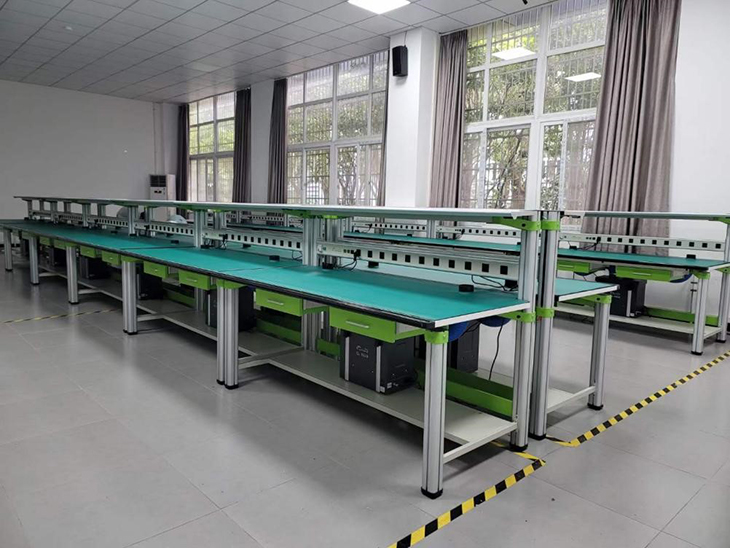 實(shí)訓桌規格為1600(長(cháng))*700(寬)*1300(高),設有一個(gè)抽屜;實(shí)驗桌主體結構全部采用高性能表面氧化的鋁型材及一次成型鋁壓鑄框架連接構件,連接構件采用壓鑄成型工藝(非焊接工藝),經(jīng)機加工、拋丸、噴砂,表面靜電噴涂工藝,安裝方便、快捷,用戶(hù)可自行DIY組裝。桌體立柱采用工業(yè)鋁型材成型工藝,表面氧化處理,截面尺寸:70mm×70mm,四面帶槽,槽寬約8mm,端部裝有注塑成型配套塑料堵頭。桌面采用25mmE1級三聚氰胺飾面板,桌面板下設支撐框架,承受力不少于300kg。配備2個(gè)抽屜,存放元件及工具。實(shí)訓裝置整體簡(jiǎn)約不簡(jiǎn)單,高端大氣,符合現代化產(chǎn)品審美和發(fā)展趨勢。