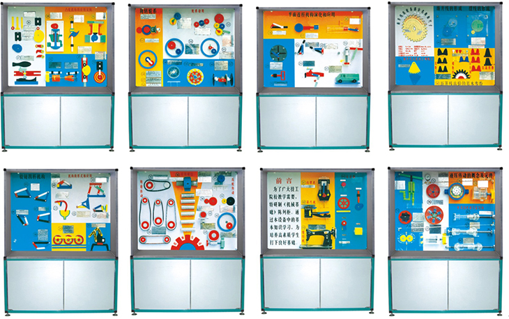 《機械原理》示教陳列柜是根據大、中專(zhuān)院校、技校、職業(yè)學(xué)校的機械原理教學(xué)大綱設計的電化教學(xué)設備。本陳列柜共分十個(gè)柜,具有多功能語(yǔ)音播放控制系統。語(yǔ)音解說(shuō)同步演示,采用單獨驅動(dòng)由電腦或電子設備控制運轉演示,可由遙控控制順序自動(dòng)運行講解,又能根據教材、教學(xué)需要而遙控任意選擇還是單獨演示。柜體采用SPCC冷扎板焊成,堅固美觀(guān),表面采用中溫磷化防銹漆、平光漆,靜電噴涂。模型材料采用進(jìn)口有機板制造,板面附有必要的圖表和文字說(shuō)明,演示形象逼真,運行可靠,制作工藝美觀(guān),使用本陳列柜可提高教學(xué)效果,節約學(xué)時(shí)是一套現代化機械課程教學(xué)應用實(shí)驗室設備。
