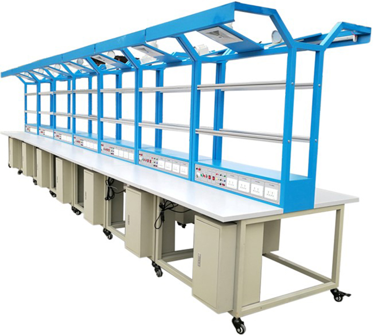 實(shí)訓臺上提供日光燈(用于照明)2個(gè),透明的PVC板4個(gè),可夾放原理圖等資料,另外還配備三芯雙聯(lián)暗插座4個(gè)、兩芯暗插座2個(gè)、工具柜2個(gè),工作臺面設有綠色防靜電桌墊,整個(gè)裝配線(xiàn)安全可靠。