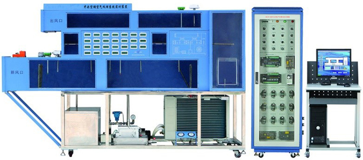 中央空調系統由實(shí)驗臺、制冷機組、制熱系統、加濕裝置、空調箱(風(fēng)道)、冷凍水系統、測量?jì)x表(包括溫濕度傳感器及風(fēng)速傳感器)、電氣控制系統、模擬熱源等組成。