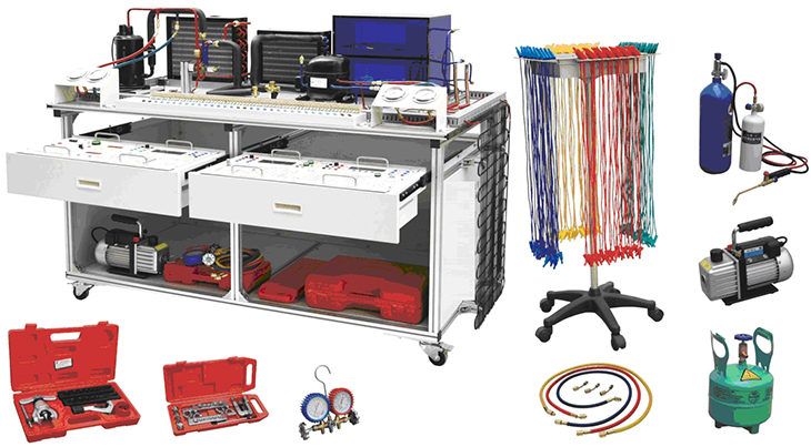 1、實(shí)訓臺采用鋁型材臺架加實(shí)訓模塊結構,裝置采用一體化設計,由導軌式鋁合金安裝平臺、空調系統、電冰箱系統、電氣控制系統等組成。底部安裝有四個(gè)帶剎車(chē)的腳輪,可以方便的移動(dòng)和固定。設備配置空調制冷系統管路1套、直冷電冰箱制冷系統管路1套、安全插端子排,壓力表(1.5MPa)2只(3.5 MPa)2只等。