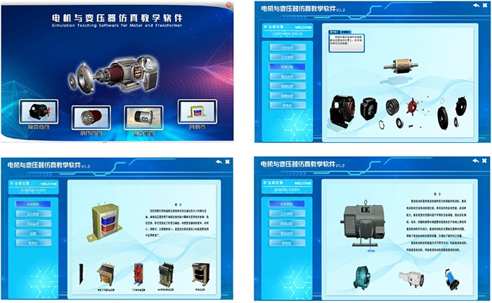 本軟件包括功率電機、控制電機、信號電機和變壓器4個(gè)實(shí)訓單元,共18個(gè)典型的實(shí)訓項目,每個(gè)實(shí)訓項目下設有外形結構、工作原理、拆裝過(guò)程、故障檢測、常見(jiàn)應用、考考你等數目不等實(shí)訓任務(wù)。