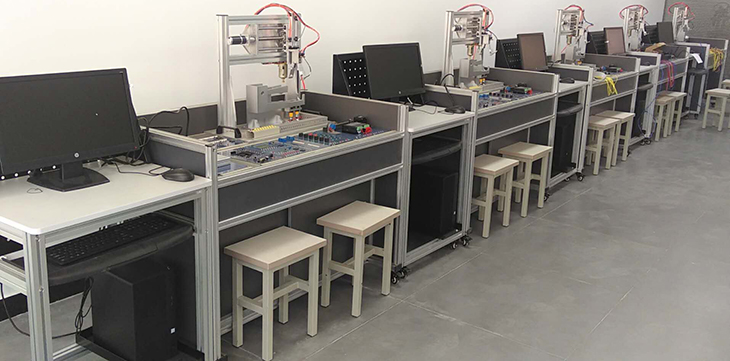 單片機控制功能實(shí)訓考核裝置采用烤漆鋼板制作的臺式結構。實(shí)訓臺的抽屜柜用于存放實(shí)訓模塊,抽屜柜與臺面之間布置實(shí)訓模塊安裝支架,最上一層是工作臺臺面。用于技能競賽時(shí)在臺面上放置設備安裝底板,在底板上安裝試題擬定的單片機控制裝置需要的模塊,連接控制電路,編寫(xiě)的控制程序輸入單片機后,按下運行指令開(kāi)關(guān),單片機控制裝置就按程序運行。