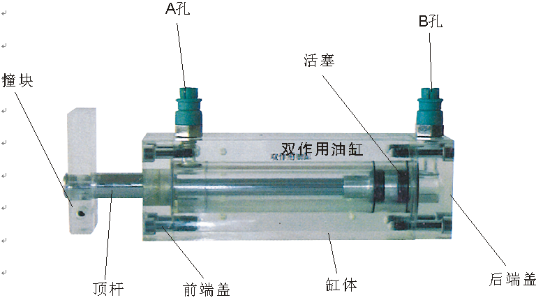 2、雙作用油缸的缸體,端蓋,行程撞塊,撞塊支承等均采用了進(jìn)口透明有機玻璃材料。頂桿采用了45#中碳鋼,并配合油接頭,密封圈,內六角螺絲等標準件精制而成。能通過(guò)它明確地觀(guān)察活塞、頂桿、油封、油孔等結構及其運行過(guò)程。