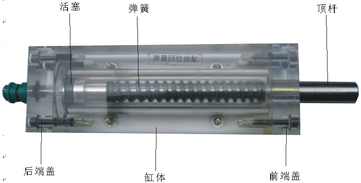 2、彈簧回位油缸的缸體,端蓋等均采用了進(jìn)口透明有機玻璃材料精制而成,透明清晰,頂桿采用45#中碳鋼材料,并配合油接頭、密封圈、內六角螺絲等標準件裝配而成,通過(guò)它可明確地觀(guān)察到活塞、頂桿、油封、油孔、彈簧等結構及其運行過(guò)程,具有形象逼真,性能可靠等腰三角優(yōu)點(diǎn),它即可作為教學(xué)模型,也可作為液壓實(shí)驗元件進(jìn)行實(shí)驗演示。