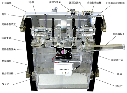 本公司設計的透明限速器,能調整到電梯模型實(shí)現限速器觸發(fā)安全鉗制動(dòng)所需要的速度,真實(shí)演示電梯安全運行保護功能(電梯模型轎廂運行速度低于實(shí)際電梯的速度20-30倍)。由于實(shí)際電梯無(wú)法實(shí)現在故障狀態(tài)下的超速運行,因此永遠無(wú)法真實(shí)演示限速器觸發(fā)安全鉗制動(dòng)的安全運行保護功能,讓學(xué)生觀(guān)察了解安全運行保護機電聯(lián)合控制的過(guò)程。