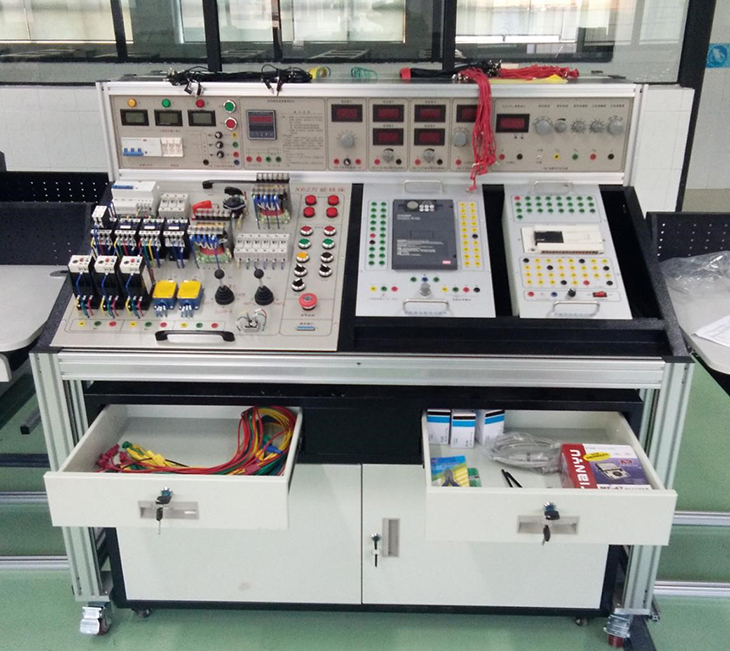 2、合理結構:設備以標準的配電柜為主柜,利用柜體的雙面空間,科學(xué)地布置電器及配套實(shí)驗器材。該柜設計合理,實(shí)操方便,一柜多用,所有電器元件接點(diǎn)都已接到接線(xiàn)端子上,學(xué)生只需在接線(xiàn)端子上接線(xiàn)實(shí)驗,延長(cháng)了電器元件使用壽命、降低了材料損耗。