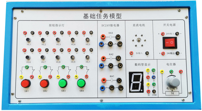 該任務(wù)盒有1.2mm優(yōu)質(zhì)鋼板加工噴涂制作,面板有鋁板加工沖孔而成,表面貼膜制作,配置有直流電機、7段數碼管、彩燈組、繼電器組、按鈕組、電位器等,能滿(mǎn)足對PLC教學(xué)基礎任務(wù)指令的學(xué)習與應用。