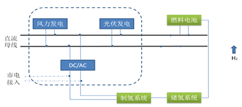 其工作原理是風(fēng)力、光伏發(fā)電系統發(fā)電,并由電池儲能,由儲能逆變系統轉換成交流電后接入電網(wǎng),燃料電池單元所發(fā)的電能經(jīng)DC-DC轉換后送入直流總線(xiàn)作后備儲能;系統可離網(wǎng)運行亦可并網(wǎng)運行,在網(wǎng)端能耗負荷內完成削峰填谷功能。