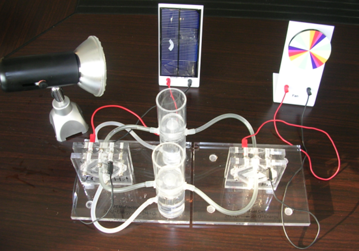 燃料電池教具是利用光線(xiàn)照射在太陽(yáng)能電池板上產(chǎn)生電能,然后利用產(chǎn)生的電能作用在電解電池模塊上,使水發(fā)生電解產(chǎn)生氫氣和氧氣。氫氣和氧氣進(jìn)入到發(fā)電模塊產(chǎn)生電能,帶動(dòng)風(fēng)扇轉動(dòng)。