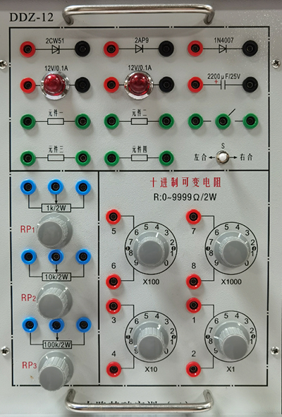 提供各種功率電阻、燈泡(12V/0.1A)、穩壓管(2CW51)、二極管、電位器(1k/2W、10k/2W、100k各一只)、電阻箱(0~9Ω/2W、0~90Ω/2W、0~900Ω/2W、0~9000Ω/2W各一組)等。