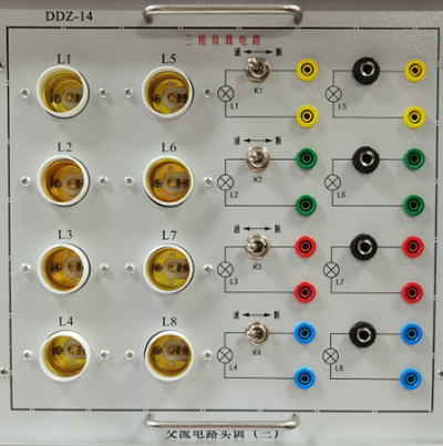 提供四組負載和四組獨立的電流插座。每組負載由兩個(gè)獨立的白熾燈螺口燈座組成(每組設有一個(gè)開(kāi)關(guān)與一個(gè)電流插座)?刹60W以下的白熾燈八只。能夠完成三相交流電路實(shí)驗。