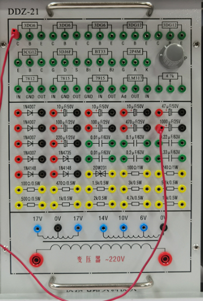 提供低壓交流電源(0V、6V、10V、14V抽頭各一路及中心抽頭17V兩路)、三極管(3DG6、3DG12、3CG12)、二極管(1N4007、1N4148)、穩壓塊(7812、7815、7915、LM317)、電阻、單結晶體管、蜂鳴器、電容等。配有相關(guān)實(shí)驗元器件。