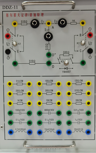 提供電阻、電感、電容、電路基礎實(shí)驗模塊和故障按鍵(3個(gè))等,完成疊加定理、基爾霍夫定律、戴維南定理、諾頓定理、電壓源與電流源的等效變換、一階、二階電路過(guò)渡過(guò)程的研究、RLC串聯(lián)諧振電路的研究等實(shí)驗。