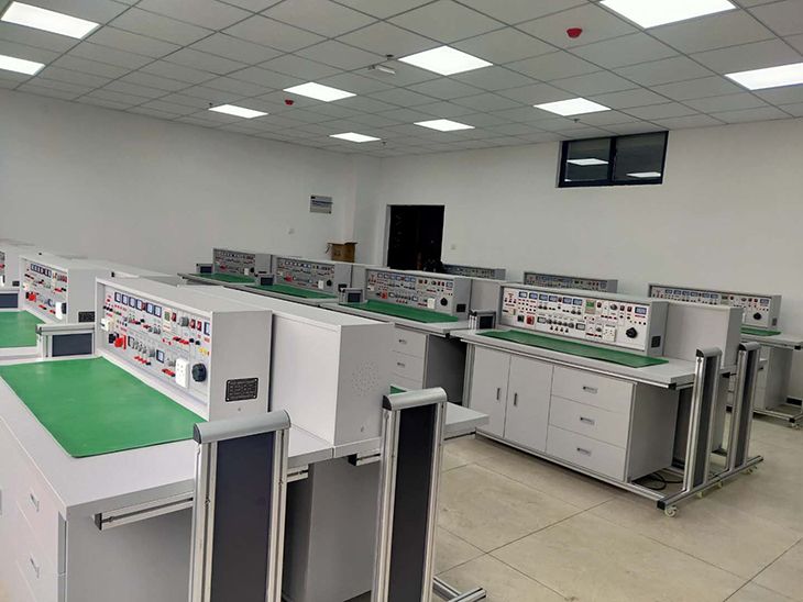 2、老師示教控制臺:1臺示教控制臺,分別控制12臺學(xué)生臺的電源。通用電路板演示屏立在實(shí)驗臺上,演示屏尺寸為160×70cm。用于講解、演示。
