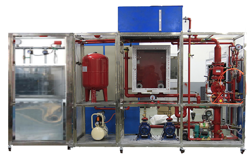 消火栓及預作式自動(dòng)噴淋滅火系統實(shí)訓裝置主要有系統設備有控制區,消防供水池、高位水泵保護區域、等主要配備有預作用報警裝置、消防氣壓罐、消防火栓箱、消防栓、消防帶、消防水泵、閉式噴淋頭、高位水泵、備用泵、氣壓泵、感煙探測器、感溫探測器、自動(dòng)充氣裝置、水流指示器、信號碟閥、壓力開(kāi)關(guān)的狀態(tài)檢測,設有全透明護區域、具有火災模擬演示等組成。管路采用渡鋅管進(jìn)行設計,渡鋅管的切割、套絲、安裝和通水試驗操作,通過(guò)控制系統實(shí)現預作用噴淋火實(shí)訓、通過(guò)控制系統可實(shí)現預作噴淋滅火功能、消防栓滅火功能。