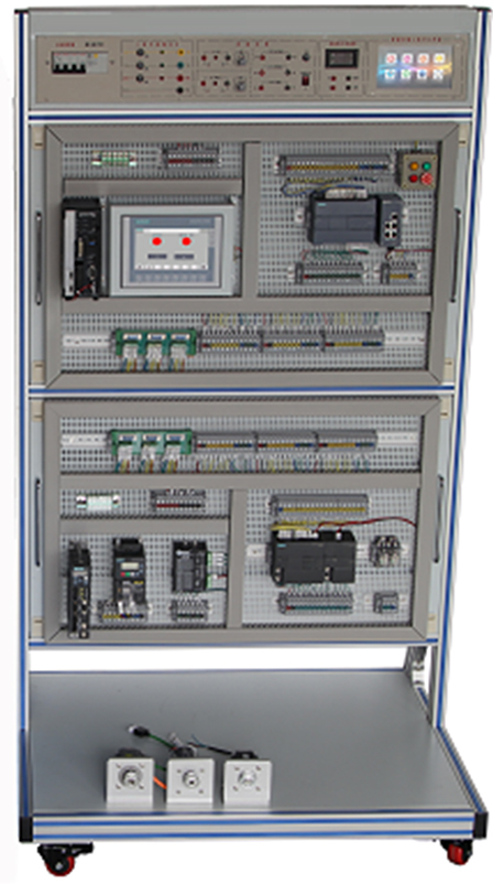 采用立式網(wǎng)孔板結構,由工業(yè)鋁型材搭建而成,上方為電源控制模塊,下方為網(wǎng)孔式安裝板。底部設有帶剎車(chē)萬(wàn)向輪,方便移動(dòng)布局。臺架尺寸約為1000×800×1800mm。 頂端電源模塊,提供實(shí)訓所需的三相交流380V、單相220V電源接口,具有啟動(dòng)、停止、急停系統,設有漏電保護、電源指示、過(guò)流保護等功能。設有DC24V控制電源,配有控制開(kāi)關(guān)及輸出接口,帶短路保護功能。 |