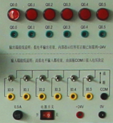 提供6路輸入、6路輸出等接口,輸入、輸出端電壓可自由切換0V和24V,輸出端由指示燈的亮滅來(lái)指示PLC輸出口的狀態(tài),面板印有清晰的說(shuō)明和端口絲印。通過(guò)基本指令練習,讓學(xué)生掌握PLC輸入、輸出的外圍接線(xiàn)和工作原理。
