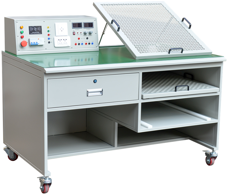 實(shí)訓裝置由電源部分、實(shí)操部分、儲物部分組成。桌面設計高度750mm符合人體工程學(xué),滿(mǎn)足絕大部分使用者的使用體驗,底部裝有4個(gè)萬(wàn)向福馬輪,方便移動(dòng)和固定。