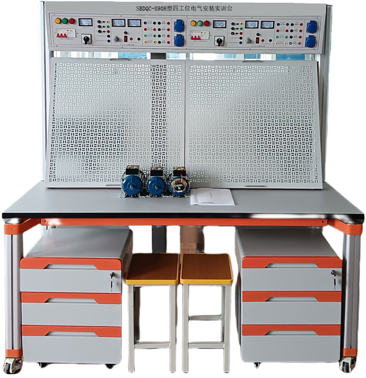 四工位電氣安裝實(shí)訓臺由實(shí)訓屏(內置電源)、實(shí)訓桌、實(shí)訓儲物柜三大部分組成。