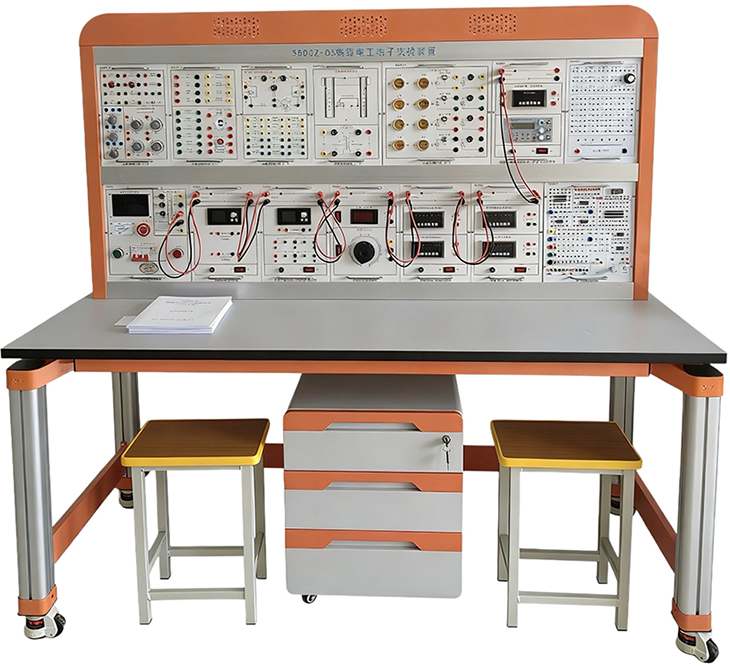 四、電工電子實(shí)驗臺主要配置及功能:電工電子實(shí)驗平臺由實(shí)驗桌、實(shí)驗臺架、存儲柜、實(shí)驗掛箱組件、配件等組成。