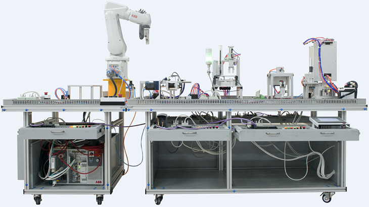 工業(yè)機器人循環(huán)生產(chǎn)線(xiàn)實(shí)訓裝備采用1+1組合式結構分別由安裝在鋁合金導軌式的實(shí)訓臺上的送料單元、加工單元、裝配單元、雙層輸送單元、分揀單元5個(gè)單元,加上由鋁合金導軌式的實(shí)訓臺上工業(yè)機器人碼垛單元兩大部分組合成多種組合方式的實(shí)訓裝備。電氣布局采用抽屜式,所有其電氣控制器都安裝在網(wǎng)孔板式的抽屜上,這種機電分離的格式更加符合了工業(yè)實(shí)際情況。外觀(guān)如上圖所示。