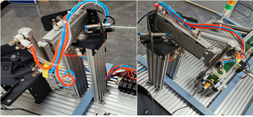 旋轉氣缸: 控制機械手臂的左右轉,由雙向電控氣閥控制。