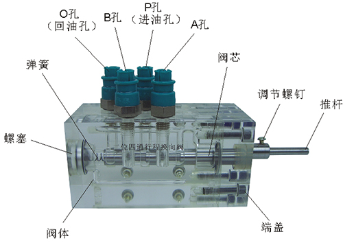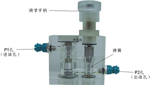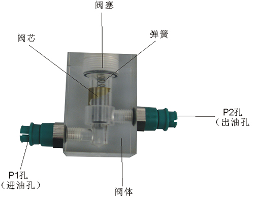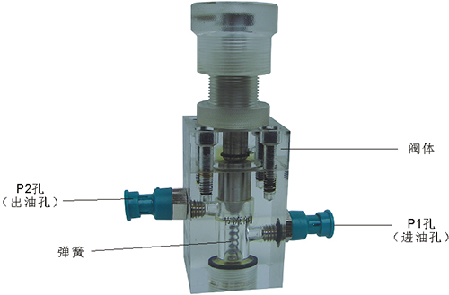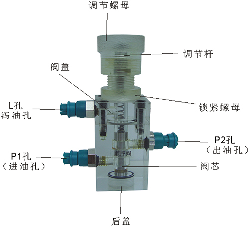 2、溢流閥結構上參考了國產(chǎn)P-63B型低壓直動(dòng)式溢流閥,其閥體閥蓋、鎖緊螺母、調節螺母、螺塞等采用了進(jìn)口透明有機玻璃材料精制而成,閥芯、調節桿采用了45#中碳鋼材料。并配合彈簧,油接頭,密封圈等標準件裝配而成,通過(guò)它可明確地觀(guān)察到閥芯、彈簧、油孔等結構及其運行過(guò)程,具有形象逼真,性能可靠等優(yōu)點(diǎn)。它即可作為教學(xué)模型,也可以作為液壓實(shí)驗元件進(jìn)行實(shí)驗演示。