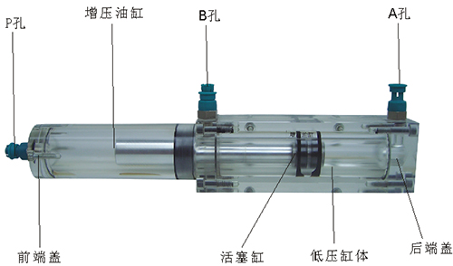 2、增壓油缸的前端、后端蓋、低壓缸體、增壓缸體等均采用了進(jìn)口透明有機玻璃材料精制而成,透明清晰,活塞桿采用了合金鋁材料,并配合油接頭,密封圈,內六角螺絲等標準件裝配而成,通過(guò)它可明確地觀(guān)察到活塞桿,油封,油孔等結構及其運行過(guò)程,具有形象逼真,性能可靠等優(yōu)點(diǎn),它既可作為教學(xué)模型,也可以液壓實(shí)驗元件進(jìn)行實(shí)驗演示。
