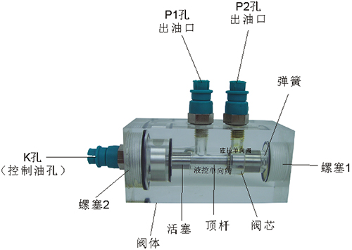 2、液控單向閥結構上參考了國產(chǎn)IY-25B型液壓?jiǎn)蜗蜷y,其閥體、螺塞等采用了進(jìn)口透明有機玻璃材料精制而成,閥芯、頂桿采用了45#中碳鋼材料,并配合彈簧,油接頭,密封圈等標準件裝配而成,通過(guò)它可明確地觀(guān)察到活塞、彈簧、油孔等結構及其運行過(guò)程,具有形象逼真,性能可靠等優(yōu)點(diǎn)。它即可作為教學(xué)模型,也可以作為液壓實(shí)驗元件進(jìn)行實(shí)驗演示。