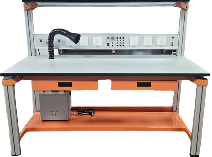 電子基本技能實(shí)訓考核裝置由儀器架、電源控制箱、實(shí)驗桌、焊錫煙霧凈化機、學(xué)生凳等組成。實(shí)驗裝置支架與實(shí)驗桌可組合、可拆裝。支架與桌腳一體,鋁合金結構。