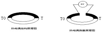 將兩種不同材質(zhì)的金屬導線(xiàn)連接成閉合回路,如果兩接點(diǎn)的溫度不同,由于金屬的熱電效應,在回路中就會(huì )產(chǎn)生一個(gè)與溫差有關(guān)的電動(dòng)勢,稱(chēng)為溫差電勢。在回路中串接一毫伏表,就能粗略地測出溫差電勢值。如圖1:
