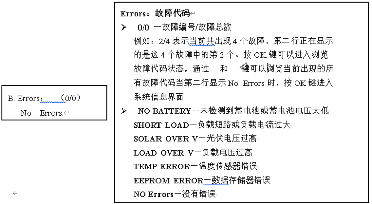 系統電壓、最大充電電流、太陽(yáng)電池方陣輸入路數、電路自身?yè)p耗、充滿(mǎn)斷開(kāi)或過(guò)壓關(guān)斷電壓(HVD) 、欠壓斷開(kāi)或欠壓關(guān)斷電壓(LVD)、蓄電池充電浮充電壓、溫度補償、使用或工作環(huán)境溫度范圍、其他保護功能