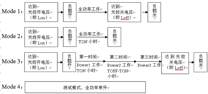 Ø 普通充放電工作模式、光控開(kāi)/關(guān)、光控開(kāi)/時(shí)控關(guān)工作模式