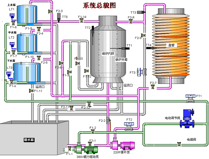 實(shí)驗對象系統包含有:不銹鋼儲水箱;上、中、下三個(gè)串接有機玻璃圓筒型水箱;三相4.5kW電加熱鍋爐(由不銹鋼鍋爐內膽加溫筒和封閉式外循環(huán)不銹鋼冷卻鍋爐夾套構成)和鋁塑盤(pán)管組成。