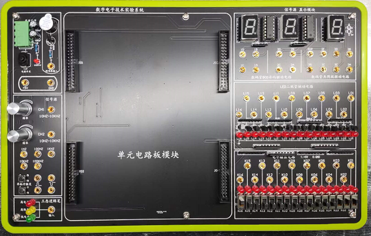 數字電路技術(shù)實(shí)驗系統是結合模擬課程的實(shí)驗教學(xué)特點(diǎn),參照現有的教學(xué)實(shí)驗產(chǎn)品,由北京師范大學(xué)老師提出設計方案并改進(jìn)而來(lái)的。產(chǎn)品借鑒了國內主流產(chǎn)品的設計特點(diǎn),總結學(xué)校在實(shí)驗課程中發(fā)現的問(wèn)題,有針對性的加以解決。產(chǎn)品本著(zhù)實(shí)驗設計型提高學(xué)生的動(dòng)手能力培養、產(chǎn)品牢固型提高產(chǎn)品的皮實(shí)驗程度不易損壞、操作靈活型產(chǎn)品使用靈活保管方便。實(shí)驗箱輕薄、簡(jiǎn)潔、大方,采用可拆卸式獨立模塊結構模式。兩路可調直流穩壓電源一路可調恒流電壓源、數據開(kāi)關(guān)、邏輯開(kāi)關(guān)、數碼顯示電路、16位電平指示電路、信號源等采用固定模式。實(shí)驗模塊采用可拆卸的標準尺寸線(xiàn)路板,便于學(xué)校根據需要升級、擴展新的內容。