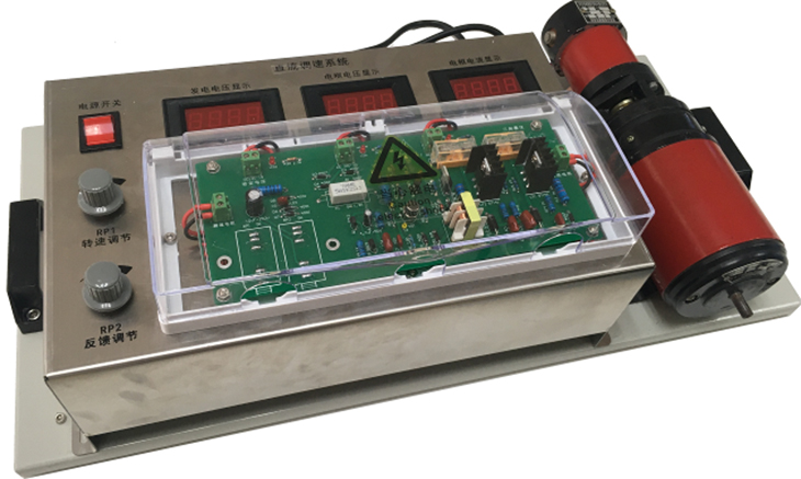 模塊底板采用優(yōu)質(zhì)Q235冷軋鋼板經(jīng)折彎后焊接而成,表面靜電噴塑處理。底板上裝有兩個(gè)黑色鑄鋁拉手,方便搬運。底板上方有直流電機、測速發(fā)電機、直流調速線(xiàn)路板、顯示系統等組成。該模塊采用測速發(fā)電機反饋電壓和給定電壓形成閉環(huán)調速系統,調速系統由給定電壓、轉速負反饋、放大電路、觸發(fā)產(chǎn)生電路及主電路組成。學(xué)員根據功能要求進(jìn)行測量分析,完成故障診斷與排除。