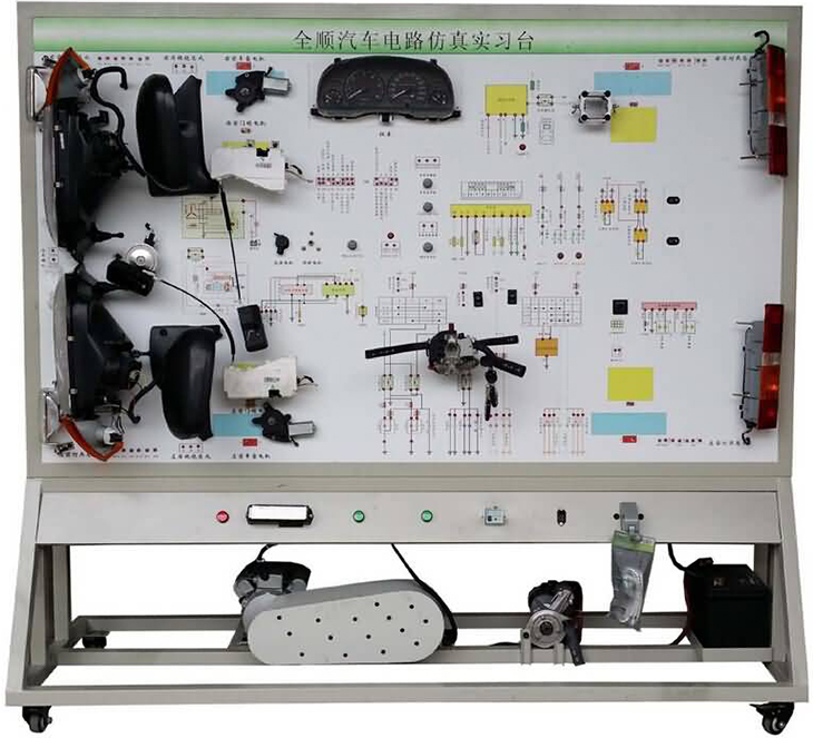 2.設備面板采用耐創(chuàng )擊、耐污染、防火、防潮的高級鋁塑板,表面經(jīng)特殊工藝噴涂底漆處理;面板打印有永不褪色的彩色電路圖;學(xué)員可直觀(guān)對照電路圖和實(shí)物,認識和分析汽車(chē)整車(chē)電器各系統的工作原理。