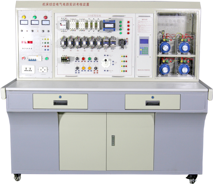 裝置主要有實(shí)訓屏、實(shí)訓機床電路掛箱、實(shí)訓桌等組成。