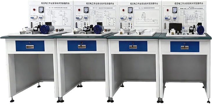 低壓電工作業(yè)安全技術(shù)實(shí)際操作臺,用于低壓電工安全操作的實(shí)訓教學(xué)。由多組操作臺構成,每組配備電氣控制元件(如按鈕、儀表、接觸器)、電機、電路原理圖板等,部分操作臺設有抽屜用于存放工具或配件。