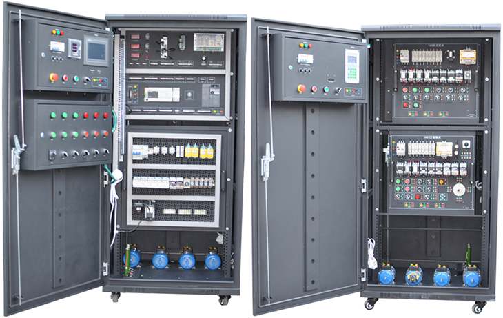 1.本裝置采用標準配電柜為主體柜,充分利用該柜雙面空間位置,其中裝有可方便拆卸的電源控制、交直流電源、測量?jì)x表、低壓電氣器件,另一面裝有PLC模擬量模塊、變頻器、直流調速模塊、機床智能考核,該配電柜占地面積小,外形美觀(guān);