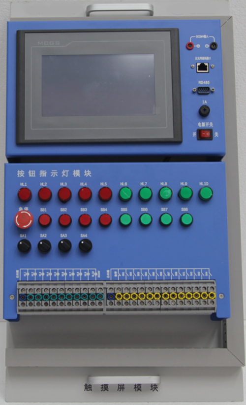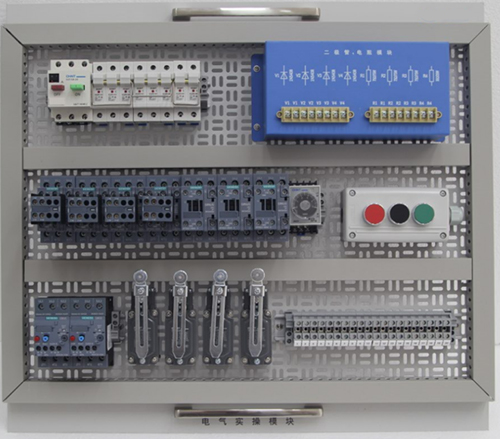 1)采用厚網(wǎng)孔板,工業(yè)灰噴塑,面板安裝一線(xiàn)品牌的電器元件(空氣開(kāi)關(guān)、熔斷器、交流接觸器、時(shí)間繼電器、熱繼電器、按鈕、指示燈、接線(xiàn)端子等)。實(shí)操模塊具有快速拆裝等優(yōu)點(diǎn),與實(shí)訓臺桌面具有一定角度安裝,符合人體視覺(jué)?梢詽M(mǎn)足電工(中級、高級)、機電考核、技能鑒定等功能。
