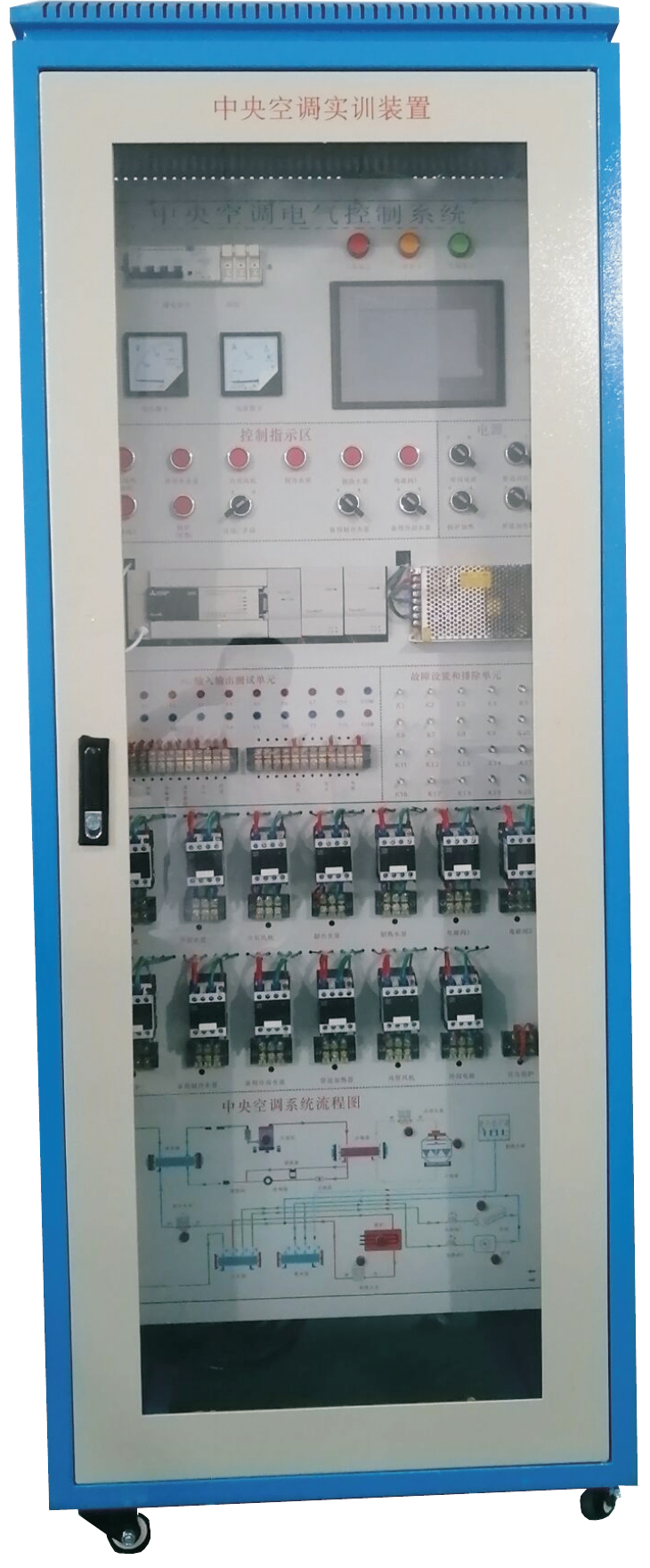 鐵質(zhì)雙層亞光密紋噴塑結構,結構堅固。前門(mén)采用透明設計,可觀(guān)察到中央控制器、接觸器、熱保護器等控制元件。面板上面有控制開(kāi)關(guān)旋鈕、工作狀態(tài)指示燈、系統流程圖及PLC主機單元及測試點(diǎn)。