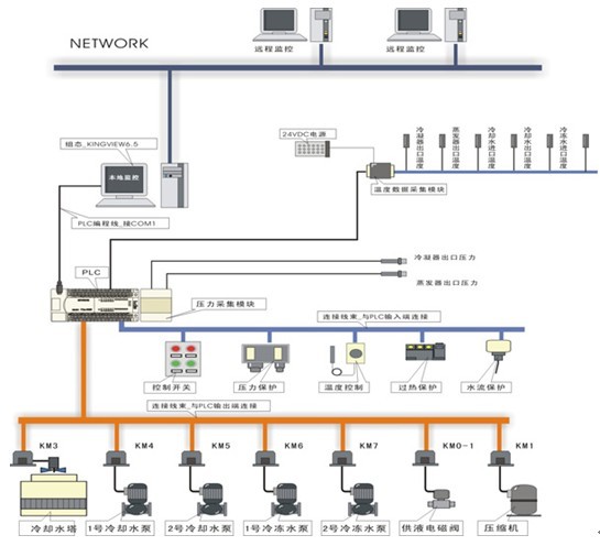 整個(gè)中央空調采用PLC可編程控制器及工業(yè)總線(xiàn)控制,由計算機通過(guò)通信總線(xiàn)與PLC進(jìn)行通信,控制整個(gè)中央空調的運行?照{的運行參數由各類(lèi)傳感器進(jìn)行采集,并通過(guò)通信總線(xiàn)送入計算機中,通過(guò)專(zhuān)用中央空調組態(tài)控制軟件進(jìn)行實(shí)時(shí)監控。在現場(chǎng)控制柜上可顯示中央空調的所有運行數據,可進(jìn)行全手動(dòng)和自動(dòng)運行操作。